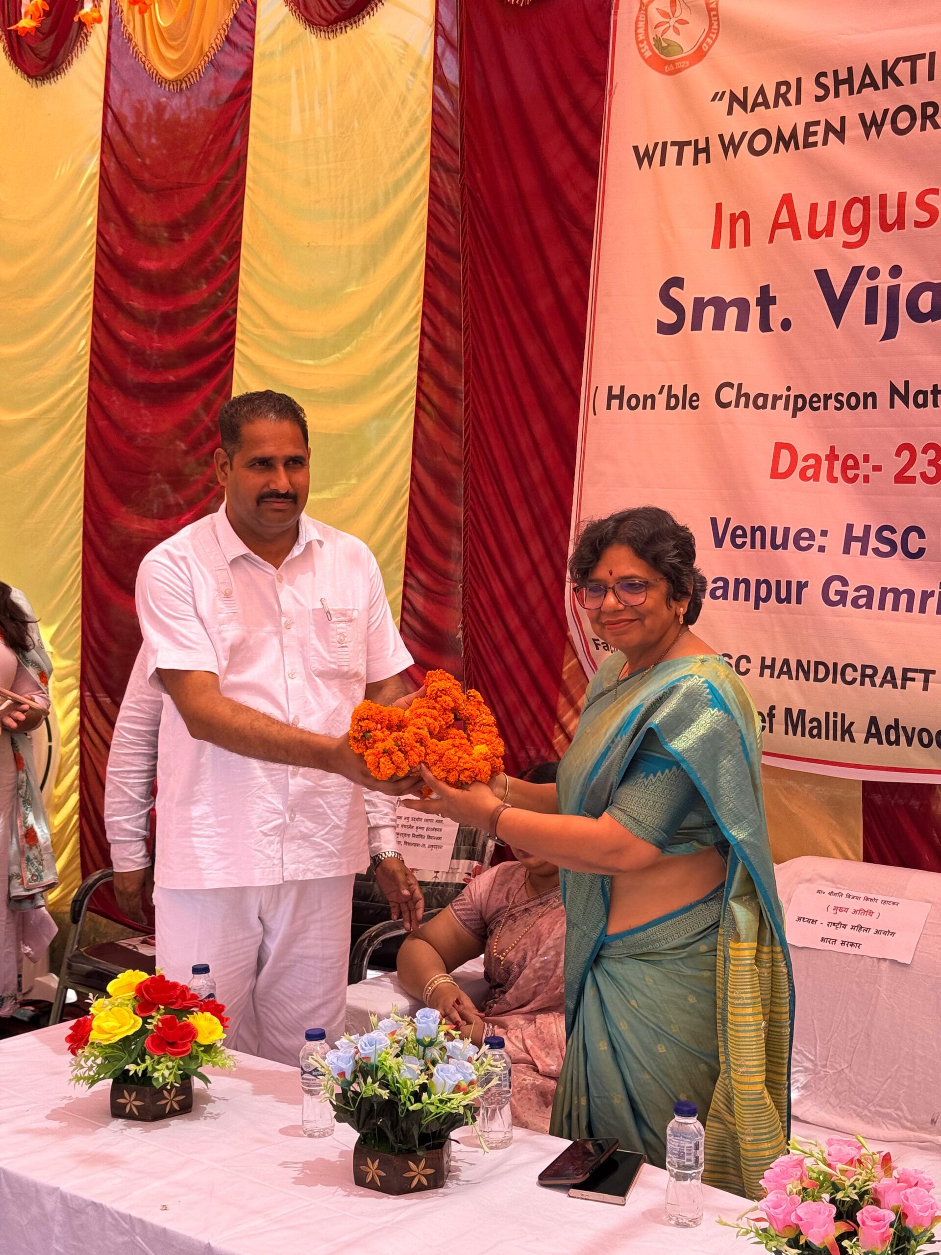 At HSC Inter College Kishanpur Gaonri Thakurdwara, NCW Chairperson Smt. Vijaya Kishor Rahatkar addressed the Nari Mission Shakti Shilp Samriddhi program, highlighting women’s equal participation in society, government schemes, and honoring women for their contributions.
